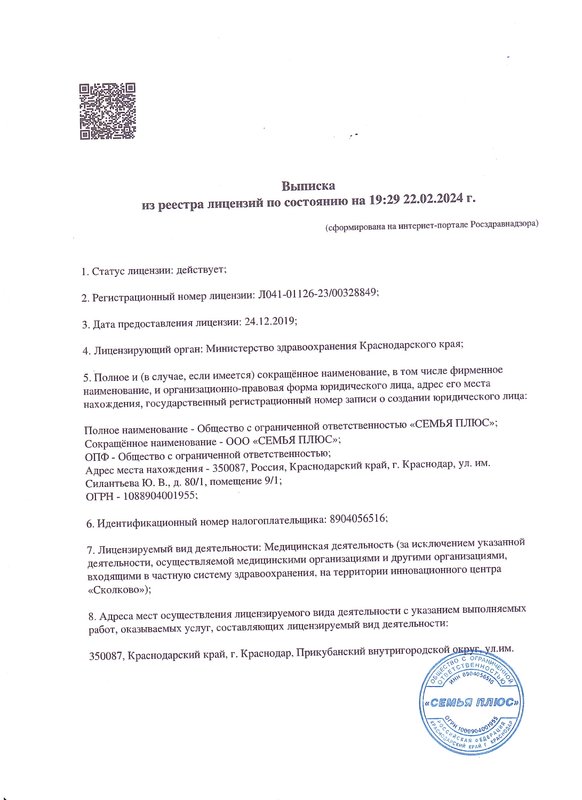 Медицинский центр Семья плюс - это многопрофильное медицинское учреждение, предлагающее индивидуальный комплекс процедур для каждого клиента. В клинике всё организовано с учетом комфортного пребывания посетителей. Новейшее оборудование центра помогает провести диагностические исследования организма пациента для составления программы лечения и профилактических мероприятий. В клинике открыты отделения гастроэнтерологии, гинекологии. Наши работники имеют соответствующие знания и с пониманием отнесутся к вашим проблемам. Доверяя свое лечение нам, вы можете быть уверены в результате.